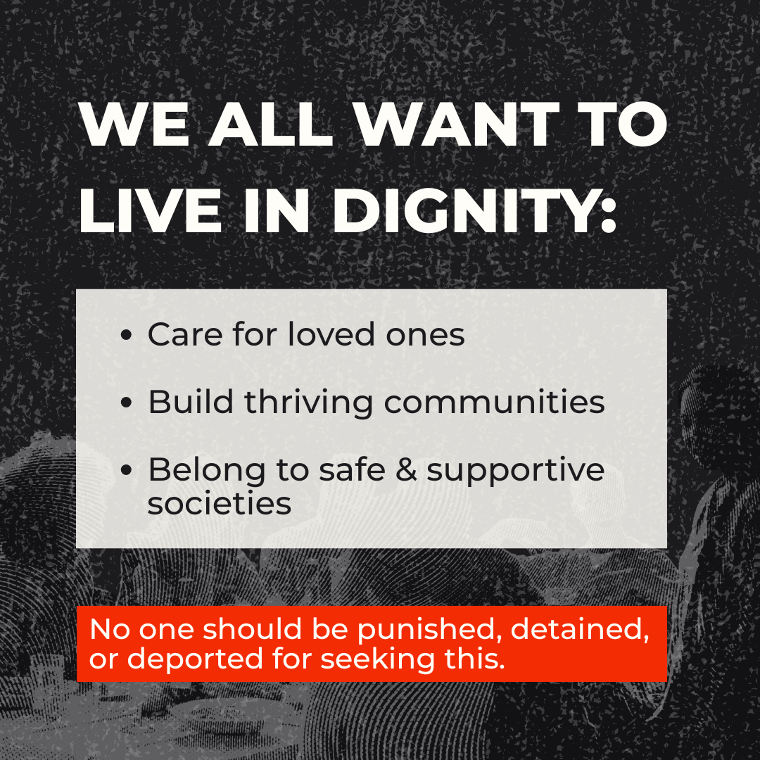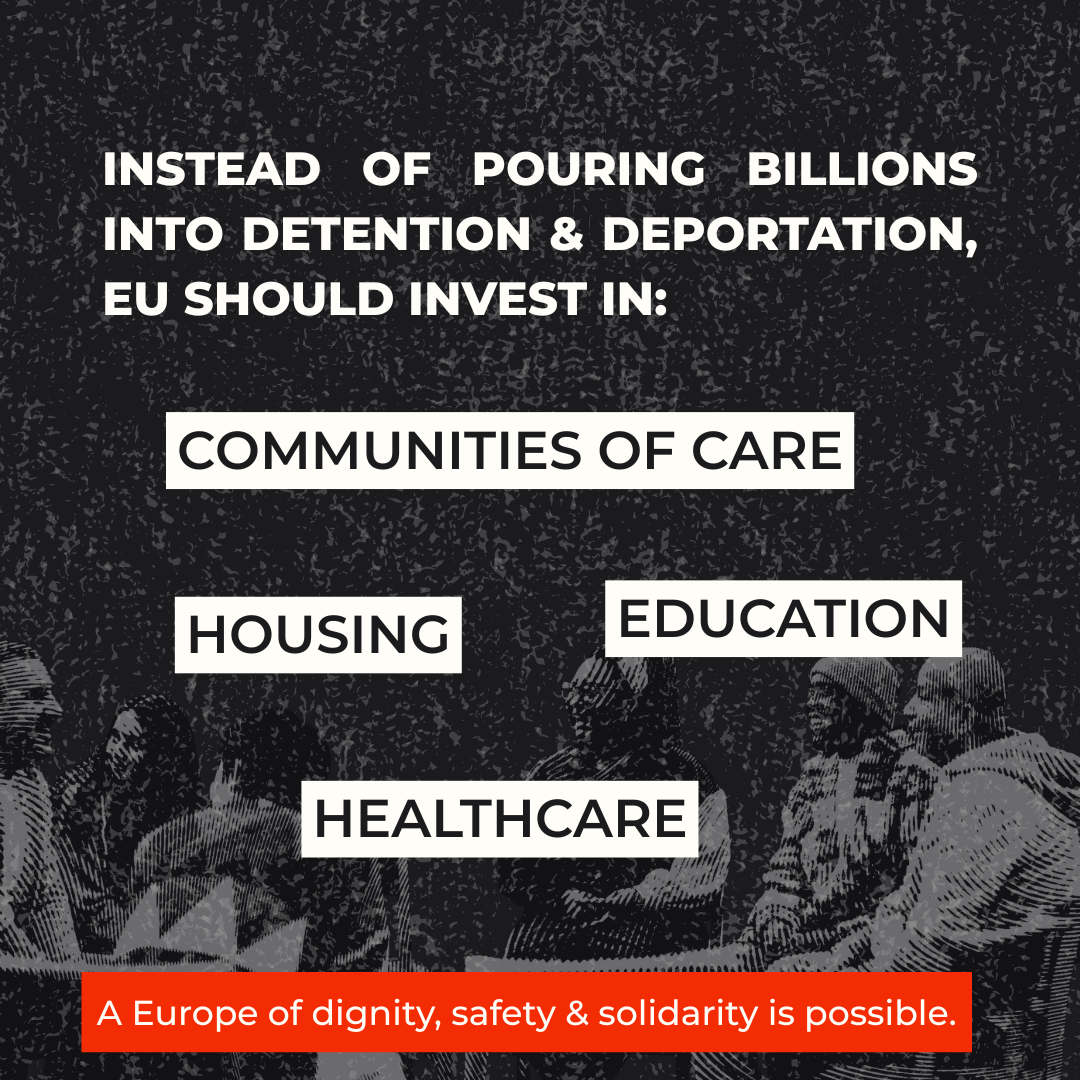 Καλούμε την ΕΕ να σταματήσει να ικανοποιεί ρατσιστικά και ξενοφοβικά αισθήματα και εταιρικά συμφέροντα, να αντιστρέψει τη τιμωρητική και διακριτική μετατόπιση στην πολιτική μετανάστευσης και, αντιθέτως, να κατευθύνει πόρους σε πολιτικές που βασίζονται στην ασφάλεια, την προστασία και την ένταξη, οι οποίες ενισχύουν τις κοινότητες, διασφαλίζουν την αξιοπρέπεια και εξασφαλίζουν ότι όλοι οι άνθρωποι μπορούν να ζουν με ασφάλεια ανεξαρτήτως του καθεστώτος τους.