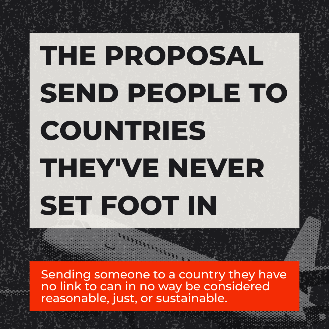 Η πρόταση αυτή – μαζί με τις προτεινόμενες αλλαγές στον Κανονισμό για τις Διαδικασίες Ασύλου – θα καθιστούσε για πρώτη φορά δυνατή την απέλαση ενός ατόμου παρά τη θέλησή του, σε χώρα εκτός της ΕΕ, με την οποία δεν έχει κανένα προσωπικό σύνδεσμο, είτε έχει διέλθει από αυτήν μόνο για λίγο, είτε δεν έχει πατήσει ποτέ το πόδι του σε αυτήν.