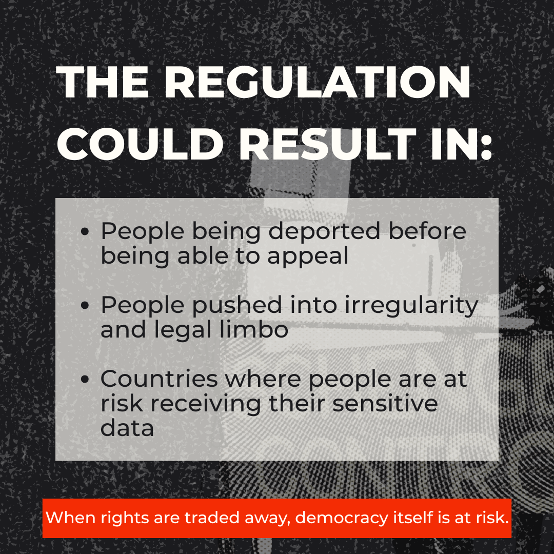 Οι οργανώσεις μας είναι κατηγορηματικές: ο Kανονισμός αυτός πρέπει να απορριφθεί. Προσανατολίζεται στην κράτηση, την απέλαση, την εξωτερίκευση και την τιμωρία, ιδίως των ατόμων που υφίστανται φυλετικές διακρίσεις, και θα έχει ως αποτέλεσμα να οδηγηθούν περισσότερα άτομα σε νομικό κενό και επικίνδυνες συνθήκες. Καλούμε την Ευρωπαϊκή Επιτροπή να αποσύρει την πρόταση και καλούμε το Ευρωπαϊκό Κοινοβούλιο και το Συμβούλιο της Ευρωπαϊκής Ένωσης να την απορρίψουν στην παρούσα μορφή της.